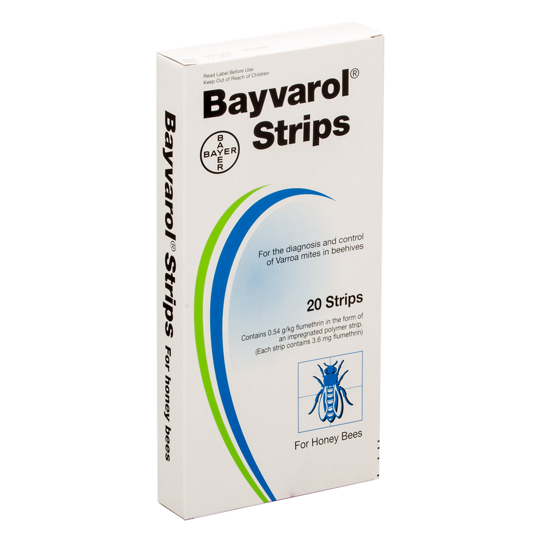 Bayvarol works by contact: the active ingredient is delivered continuously over the 8 week treatment period. As bees walk on the strip’s surface they pick up molecules of the active ingredient and then distribute them throughout the colony. Bayvarol is the only flumethrin-based apiary product that treats several successive generations of varroa mites, reducing mite populations in the hive by up to 99% in 1 application.