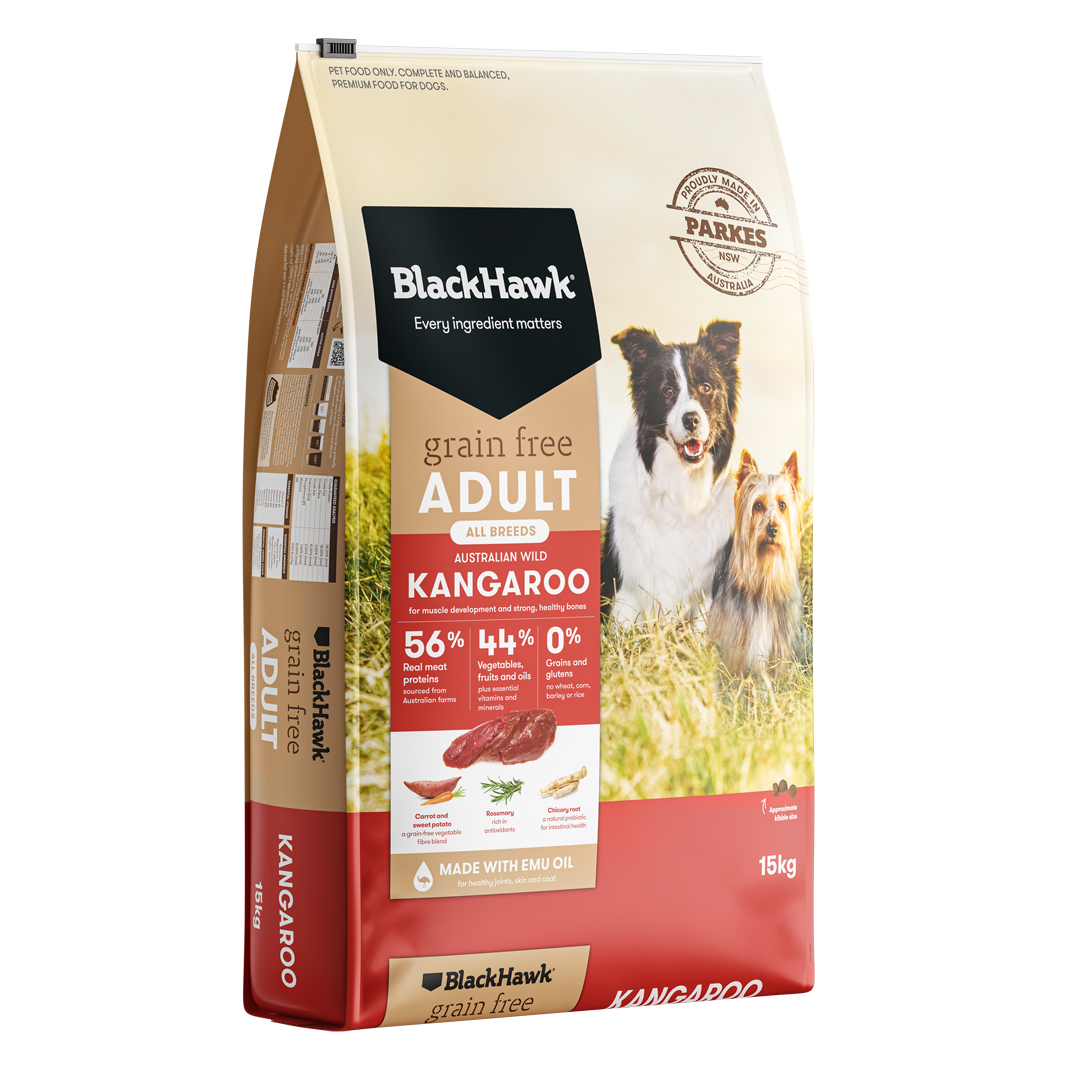 - Black Hawk Grain Free Kangaroo dog food serves a uniquely Australian, tasty source of protein-packed with amino acids essential for the support of muscles, healthy bones, and vitality.