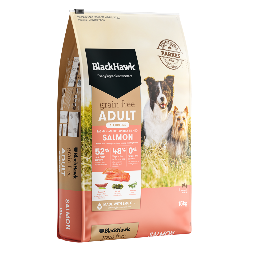 - Black Hawk Grain Free Salmon dog food, with select quality Australian salmon as a tasty and highly digestible source of protein, provides a balance of amino acids to help support skin and coat health.