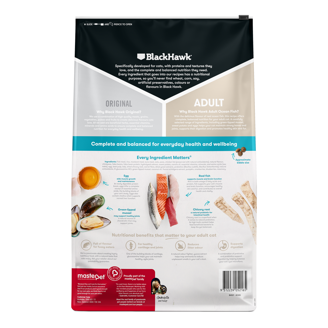 With the delicious flavour of real ocean fish, this tasty recipe offers complete and balanced nutrition for your adult cat. A carefully selected range of ingredients, including green-lipped mussel, sweet potato and egg helps your cat maintain strong bones and joints, supports their digestion and promotes healthy skin and fur.