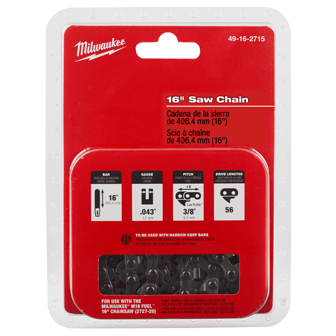The MILWAUKEE 16” (406 mm) Chainsaw Chain is to be used with the MILWAUKEE M18 FUEL 16" Chainsaw (M18FCHS-0). The design delivers fast cuts with low vibration and minimum kickback.