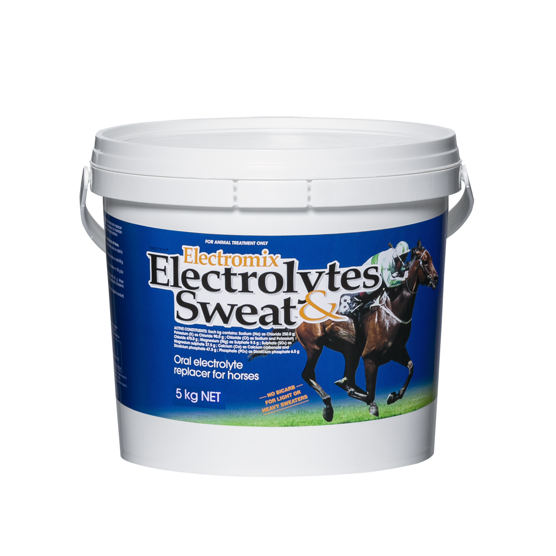 ELECTROMIX ELECTROLYTES & SWEAT™ is formulated for horses that are subjected to continual periods of physical exertion resulting in body salt and fluid loss, helping to correct fluid balance and to assist in the prevention of dehydration. Sodium, potassium and chloride ions are the three ions that are predominantly lost in sweat. Calcium and magnesium play the role in neuromuscular transmission.