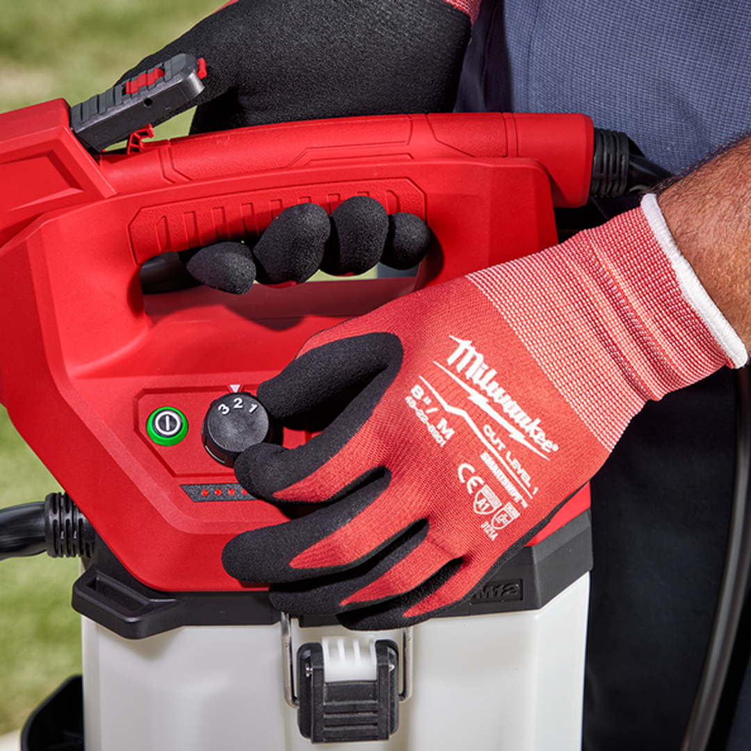 The battery-powered handheld sprayer delivers instant, constant and adjustable pressure, up to 80 PSI, with up to 5.0 metre vertical spray distance. The 3-speed pressure adjustment knob adjusts the pressure between 20 – 80 PSI for ultimate user control across a range of spraying applications. When paired with an M12™ REDLITHIUM™-ION 2.0Ah Battery (sold separately), the chemical sprayer provides users with up to 300 litres of spray delivery per charge. The M12™ Powered Sprayer Head is compatible with both 4 Litre and 7 Litre Chemical Sprayer Tanks, providing the ability to choose the right size the tank for the application at hand, and premix multiple tanks to maximise productivity. The Handheld Chemical Sprayer can be used either one- or two-handed for added versatility. The sprayer features an onboard measuring cup for quick chemical measurement, a strainer that filters debris from entering the tank, and vertical and horizontal wand storage. With a dual diaphragm pump for increased durability and maximum pump life, the M12™ 7 Litre Handheld Chemical Sprayer provides instant, constant pressure while reducing fatigue associated with manual pumping.