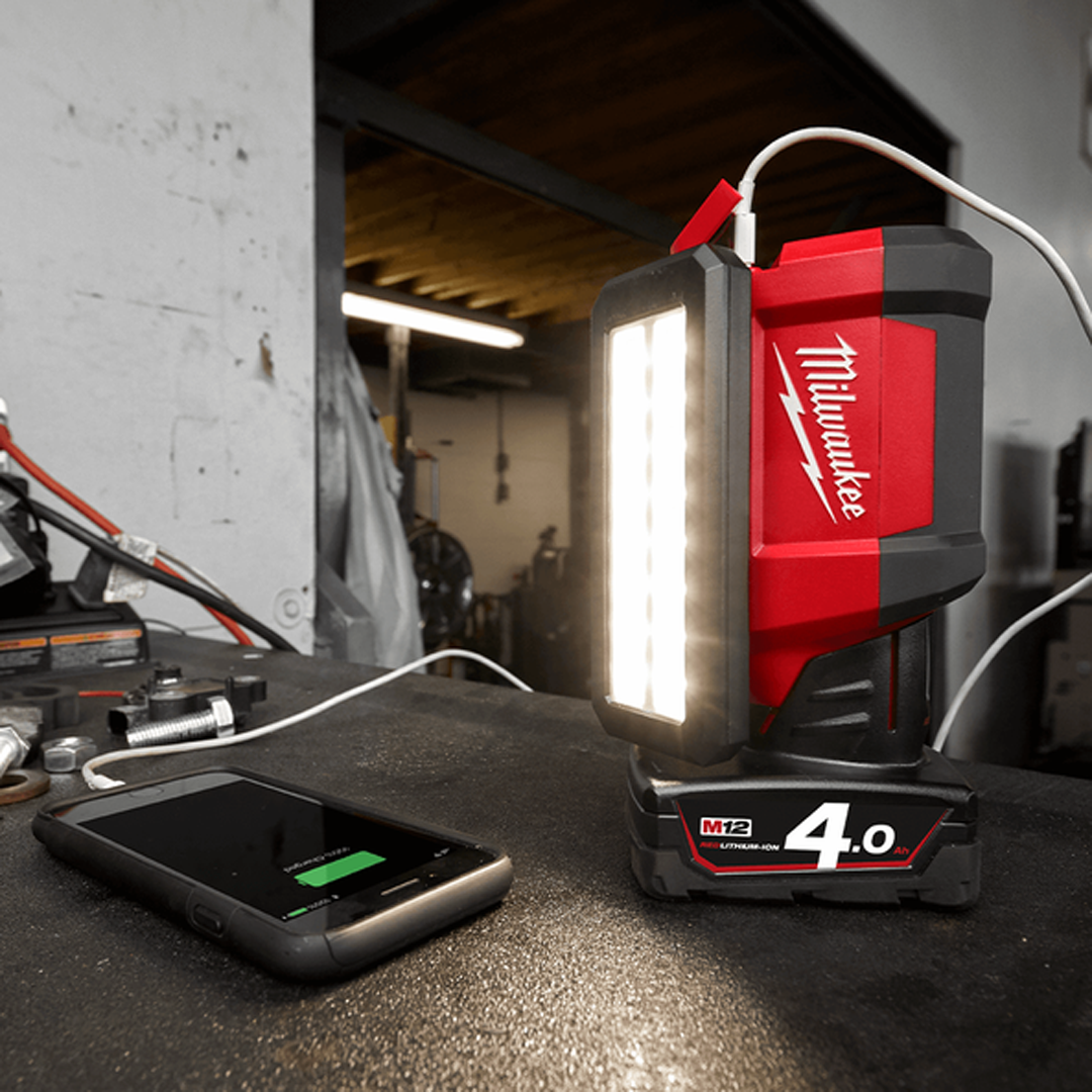 The light provides 700 lumens of TRUEVIEW™ High Definition Output in high mode, and is capable of lighting up a workspace for up to 24 hours with an M12™ REDLITHIUM™-ION 4.0Ah Battery, and features a light head that pivots 110° for users to orient the light in multiple directions. The light comes equipped with a strong rear-facing magnet made for jobsite surfaces like steel studs, I-Beams, and job boxes. The light’s streamlined base with an overmolded grip gives users a comfortable handheld option for inspection lighting. A 2.1A USB port is included with the M12™ Pivoting Area Light for charging a phone or external device. The light features an integrated keyhole for hanging capability on non-metallic surfaces. The light has an impact-resistant lens protecting the LEDs, and can survive up to 2.7 metre drops, allowing it to withstand a drop and keep working.