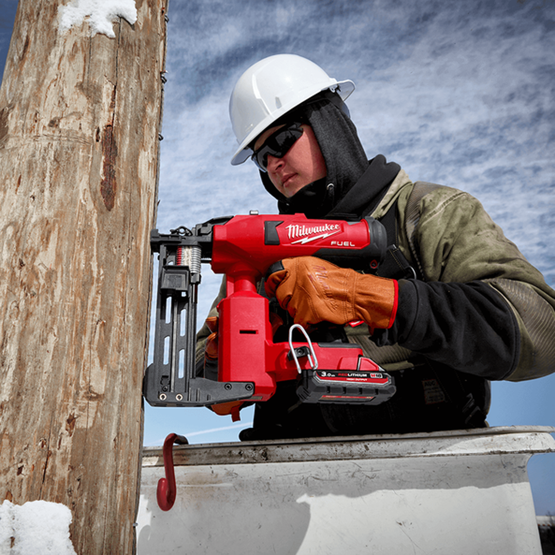 By leveraging our Nitrogen Spring technology, POWERSTATE™ Brushless motor, and REDLINK™ Intelligence, this stapler delivers the power to seat staples into the toughest Fence Post Materials. Our M18 FUEL™ Fencing Stapler provides our users maximum Increase in productivity and a reduction in Peak Muscle Effort compared to Manual Staple Installation. Our cordless stapler is designed for compatibility with our 9 Gauge Galvanized Staples (sold separately) available in three sizes: 40, 45 & 50mm. When paired with our M18 REDLITHIUM™ CP3.0 Battery pack, this stapler gives users the ability to sink up to 600 staples per charge no gas cartridge required. Our M18 FUEL™ Fencing Stapler joins the M18 System of over 200 solutions and is compatible with all M18™ REDLITHIUM batteries.