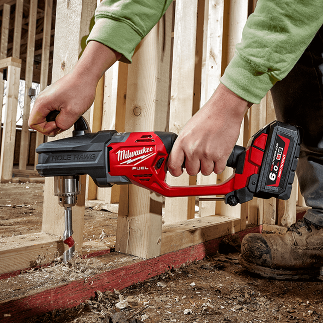 Optimised for many applications, the M18 FUEL™ HOLE HAWG™ Right Angle Drill delivers game-changing productivity for professionals drilling with augers up to 32mm and self-feed bits up to 50mm. The POWERSTATE™ brushless motor delivers better performance than corded drills, especially under heavy load. REDLINK PLUS™ Intelligence is the most advanced electronic system on the market, preventing damage to the tool and battery caused by overloading or overheating. The REDLITHIUM™-ION battery packs provide maximum run time and recharges than standard lithium, operate down to -18C. and have a battery fuel gauge to display the remaining charge.