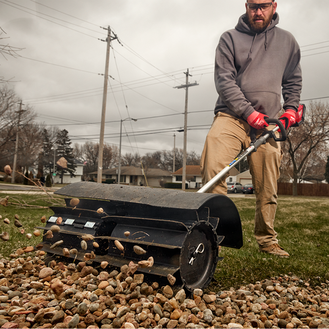 This attachment's durable rubber paddles are designed for removing debris such as mulch and gravel from grass without disruption to the material beneath. The debris guard provides users maximum material containment as the 585 mm clearing width lets users maximise their productivity, clearing areas in fewer passes. QUIK-LOK™ Attachments feature protected drive shafts for greater durability against drops and storage elements. The Rubber Broom Attachment also features optimised gearing to manage the cordless M18 FUEL™ Outdoor Power Head RPM output, specifically geared for this attachment.