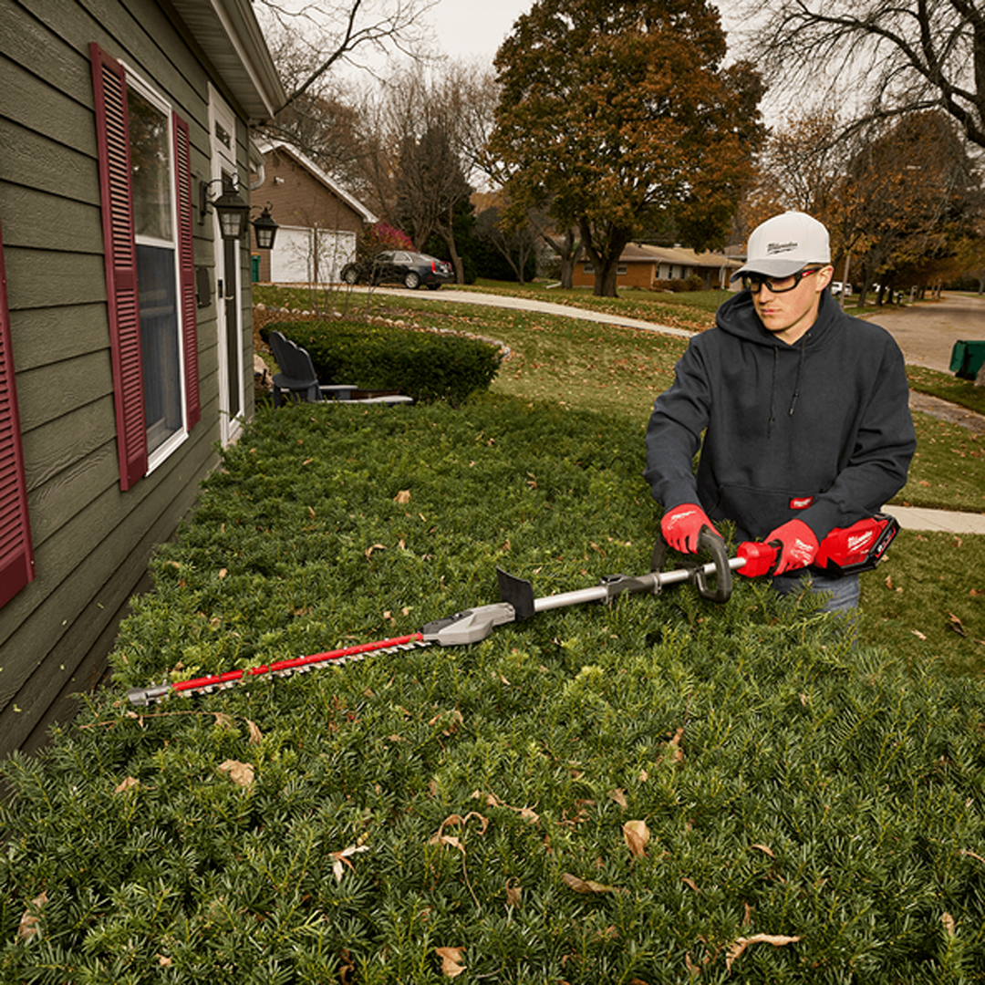 The M18 FUEL™ QUIK-LOK™ Short Shaft Hedge Trimmer Attachment is powered by the M18 FUEL™ QUIK-LOK™ Outdoor Power Head and is compatible with the M18 FUEL™ QUIK-LOK™ Attachment System, providing users with maximum versatility to complete a wide array of applications. The Short Shaft Hedge Trimmer Attachment clears branches up 19 mm (3/4") in a single pass during seasonal pruning and shaping applications. The Short Shaft Hedge Trimmer Attachment features a tip guard, preventing damage to blades and the surrounding work area for enhanced productivity and reduced maintenance. M18 FUEL QUIK-LOK™ Attachments feature protected drive shafts for increased durability against drops and while in storage. The split boom Short Shaft Hedge Trimmer Attachment also utilises M18 FUEL™ Technology, combined with optimised gearing to manage the RPM output specifically for hedge trimming applications.