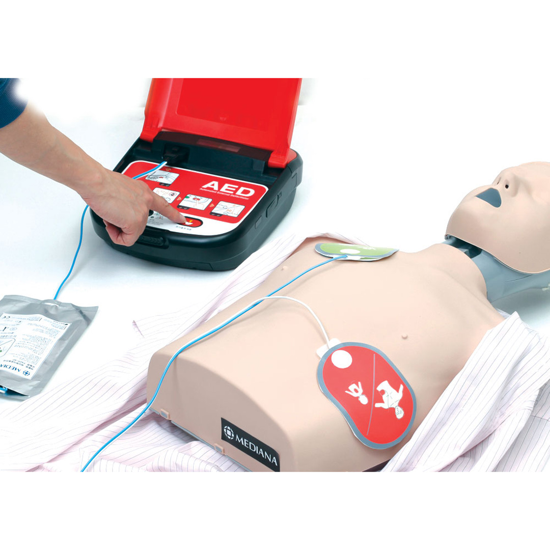 The HeartOn A15 AED by Mediana is a Korean manufactured defibrillator packed full of fantastic features. Designed to be used by those who are minimally trained in the use of an AED, the HeartOn AED ensures users are comfortable and confident by offering voice and visual prompts. The instant switch for adult and paediatric mode means that this product is perfect for environments with mixed age groups. Automatically switches on when opened so it's immediately ready to be used. Electrode pads are suitable for use on both adult and paediatric casualties. Visual and verbal prompts. LED indicator lights flash with the corresponding voice prompts. Self-testing with visual and verbal indicators. Disposable battery built into the handle.