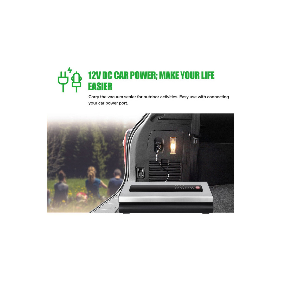 - 12V DC Car power- Carry the vacuum sealer for outdoor activities. Easy use with connecting your car’s power port.